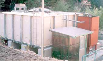 このシステムは、当社独自の設計により、生物処理槽に固定床を埋設させてろ材に微生物を定着させる微生物処理法であり、接触酸化法と呼ばれるものであります。